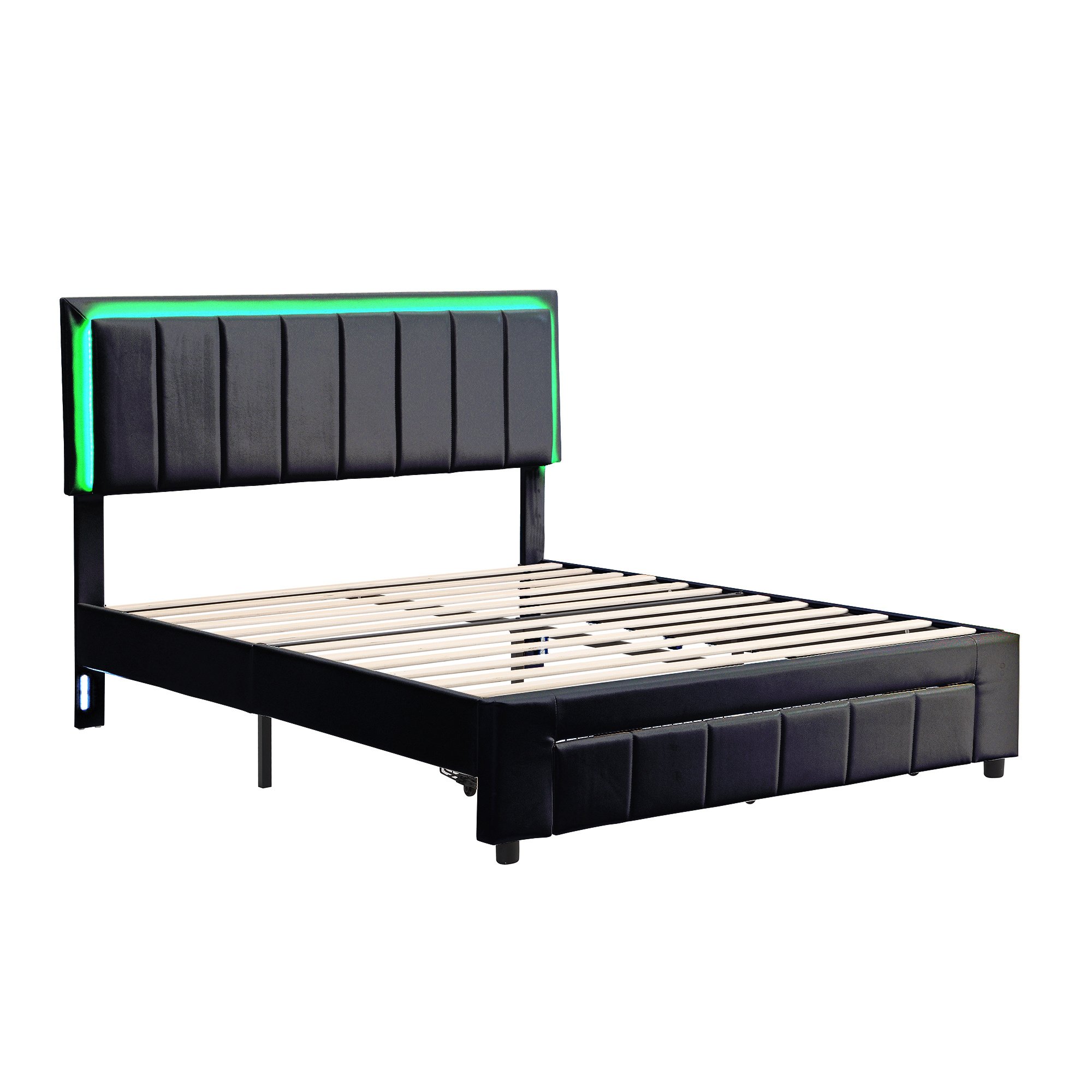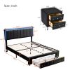 Queen Bed with LED Lights and Drawers, Two Nightstands with Crystal Decoration, BlackThis tufted PU upholestered bed with LED lights is easy to make your home unique.The LED lights have so many color options, bringing you a romantic night and a comfortable sleep.The motion activated nightlight will turn on when you go to bed or get out of bed. Really a nice guide in the dark room.There is a large drawer at the end of the bed for your storage.Sturdy wood frame construction and a wooden slat system to add extra stability and safety.