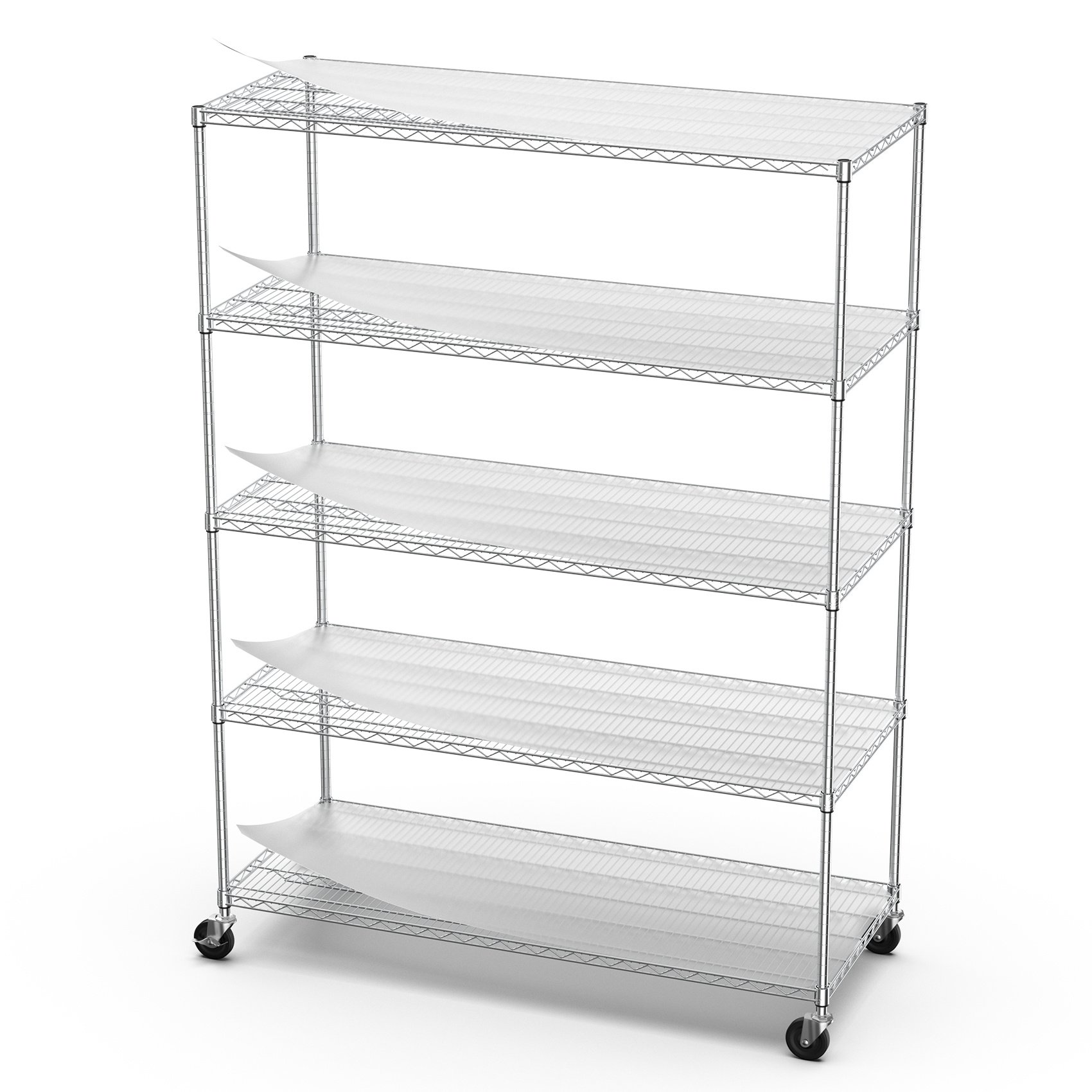 [5 TIER LARGE CAPACITY] - Heavy duty shelving with leveling feet - each layer shelf can hold 1500lbs (evenly distributed), maximum load capacity is 7500lbs. It is recommend that heavy items on the bottom shelf for maximum stability. 5 shelf Liners choice of beautiful and fun transparent colors allow you to add a pop of color to your life. Shelf liners is waterproof - Won't get damaged from exposure to moisture. [STURDY & EXTREMELY DURABLE] - Wire shelving made of heavy steel, it has excellent rust resistance and oxidation resistance. Our wire shelf liner is crafted to provide unparalleled quality, longevity, function and beauty. Better quality thicker than the competition. The 5 tier shelf unit passed NSF certified, safe and reliable. Storage rack are perfect addition to home, office, garage. [ADJUSTABLE DESIG] - Each shelf can adjustable in 1-inch increments, adjust the shelf height according to size of the item, meet your different needs, get the best utility shelf. Create two new shelf by splitting the top pole, you can split it according to your actual needs and achieve multiple uses. [EASY MOVEMENT] - 5 tier garage shelves have 4 leveling feet, 4 4-inch industrial wheels(2 lockable). Wire rack on wheels can be easily positioned in supermarkets, garages, closets, kitchens, porch, pantry, etc. Height-adjustable leveling feet can be placed on uneven ground- simply twist to stabilize. Non-slip, will not scratch ground. [EASY TO ASSEMBLE] - With detailed instructions and no tools required, you can install it easily with another person within 15 minutes. There are many parts in the package, please feel free to contact us via buyer message if meet the case of missing parts and assembly.