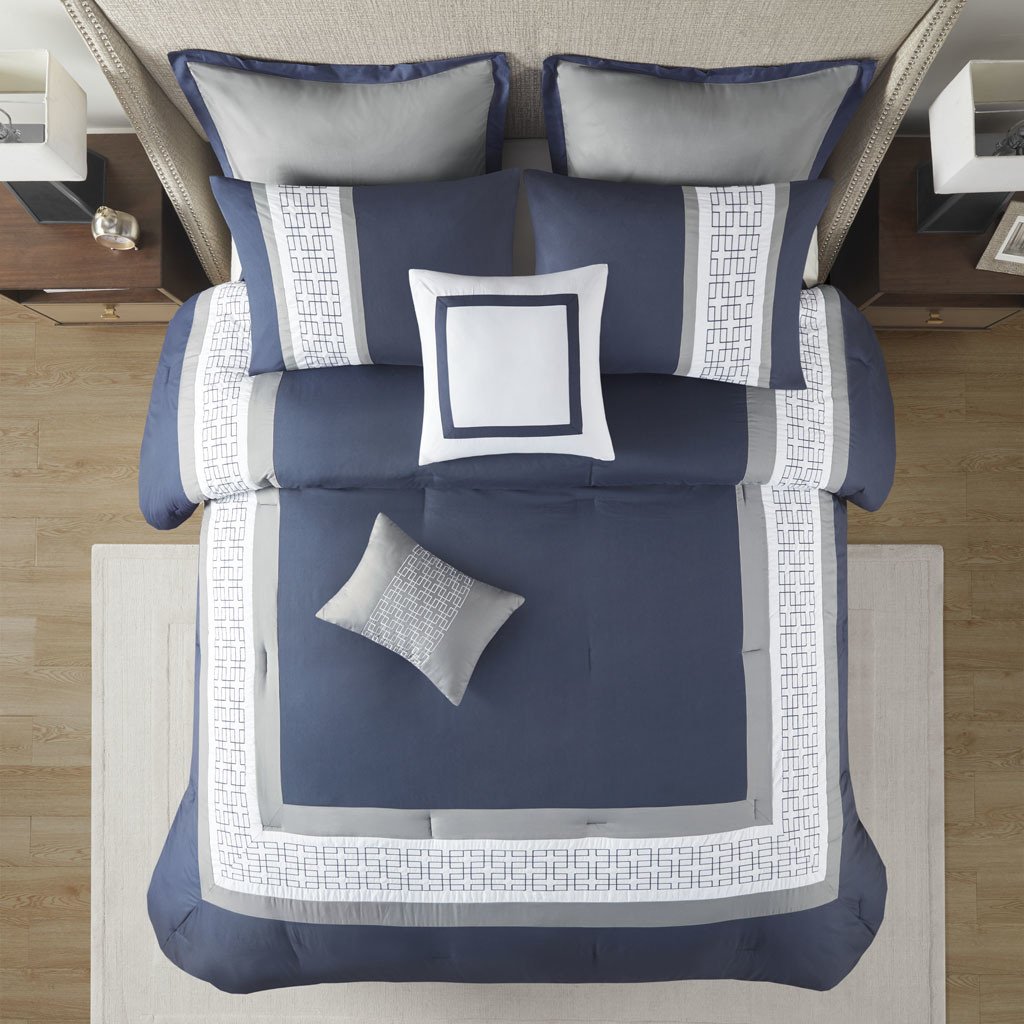 Description510 Design presents the Powell 8 Piece Embroidered Comforter Set to elevate your bedroom decor. This hotel style navy comforter features an embroidered and pieced border for a sophisticated and elegant design that easily coordinates with your space. The matching pillow shams also flaunt beautiful embroidery details, while the grey Euro shams are accented with graceful navy flanges to complete the transitional look. A solid navy bedskirt and 2 decorative pillows with embroidered details add the finishing touches to this hotel style bedding set. Hypoallergenic polyester filling in the comforter and pillows contains no allergens and is treated to be dustproof. Machine washable for easy care, this embroidered comforter set may come in rolled or compressed packing and will need to be fluffed up. Use a steam iron to help remove wrinkles easier.Product DetailsQueen1 Comforter:90"W x 90"L2 Standard Shams:20"W x 26"L (2)1 Bedskirt:60"W x 80"L + 15"D1 Decorative Pillow:12"W x 16"L1 Decorative Pillow:18"W x 18"L2 Euro Shams:26"W x 26"L (2)MaterialComforter and shams: 100% polyester microfiber, pieced with embroidered face and microfiber reverse, 6 oz/sq yard polyester filling Bedskirt: 100% polyester microfiber drop, non-woven platformPillow: 100% polyester microfiber cover, 100% polyester filling, Euro sham: 100% polyester microfiber
