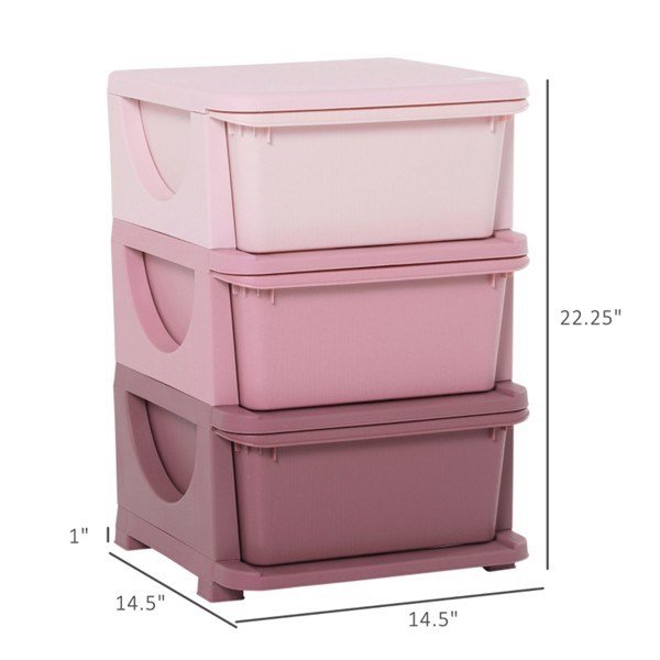 Features:- Rounded edges help prevent your kid from getting injured in case they fall- Easy to open and close, making it suitable for your sweetie- Compact for easy fit, and spacious inside 16 L drawers- Fully remove the bins to search for items- Easy wipe down for clean- Short for young kids- Assembly requiredSpecification:- Color: Pink- Material: PP- Overall Dimensions: 14.5" L x 14.5" W x 22.25" H- Drawer Dimensions (Inner Space): 13" L x 12.5" W x 6" H- Feet Height: 1"- Weight Capacity (Each Tier): 22 lbs.- Drawer Capacity: 16 LPackage Includes:- 1 x Toy Cubby Storage- 1 x Manual