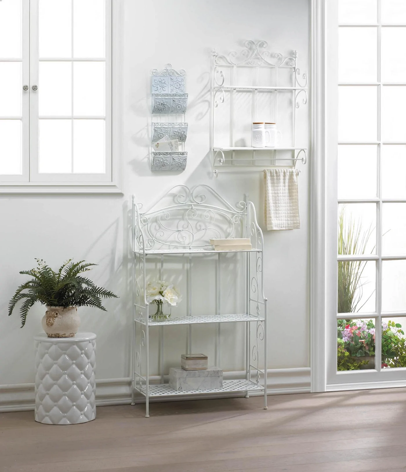 • Add style and organization to your room with this beautiful white bakers rack. It features three basket weave shelves, scrolling flourishes for added style, and a few fleur-de-lis accents that are the perfect finishing touch.