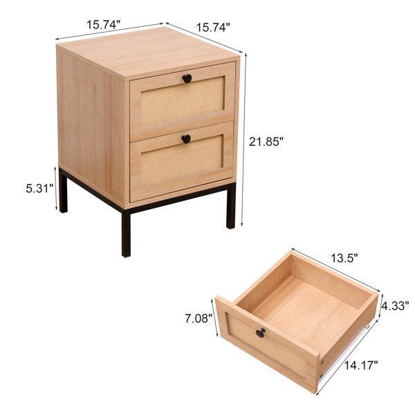 MEETING NEEDS--This nightstand features 1/2 Drawer spacious space for storage and stuff organization.it keeps your room look tidy and organized. The vertical design fits easily in many locations throughout the home.PREMIUM MATERIAL--The nightstand are handwoven natural rattan, high-quality MDF board and superior metal legs support, which has good load-bearing and stability. Equipped with round handles and smooth rails, easily open and close the drawer. Smoothly painted surface is very easy to clean.STURDY & DURABLE--The nightstand of this storage organizer is constructed of wood which is stable and sturdy enough to hold any stuff on it; Wood top provides a hard surface to place lamps, books, decor and more on top.EASY TO ASSEMBLE--The end table with drawers is easy to assemble, we offer clear and easy-to-read instructions and marked all the spare parts, ensure it pretty simple for everyone.Rattan nightstand Size40 x 40 x 55cm (WxDxH)15.74"D x 15.74"W x 21.85"H